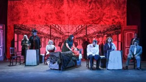 Each scene, efficiently rotated by a costume-changing ensemble of four (creative costumes by Pam Stompoly-Ericson), provides us with views of the train’s exterior, its chic dining room and the interior of three adjacent sleeping compartments. The stunning, intricate black-and white dining area looks like the hand-drawn pen-and-ink creations of the Old Masters, enhanced by mood-setting lighting (Mashun Tucker).