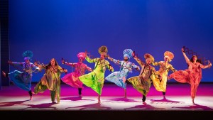 In this co-production with The Huntington, the creative/design/technical work is outstanding: the eye-popping set (Robert Brill), costumes (Linda Cho) and lighting (Amith Chandrashaker); Stafford Arima’s forceful direction; the amazing, kinetic choreography of Rujuta Vaidya and ‘musical staging’ by Lisa Shriver; the projections of David Bengali, the orchestrations of Justin Goldner and Deep Singh. Singh wrote the additional music and appears onstage playing the Dhol, the large, two-sided drum, and providing the all-important percussion section for the four other parts of the orchestra (keyboards; acoustic and electric guitars and mandolin; electric bass; and bansuri/flutes, to create the unique and electrifying soundscape.