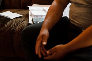 Court papers and a SmartLINK phone device are on a couch at the home of a man who faces deportation in San Diego. The app requires him to check in every Thursday. (Kristian Carreon/inewsource)