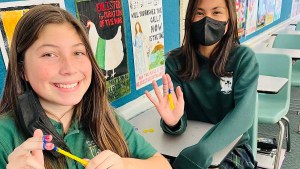 Seventh-graders Faith Poling and Addie Tayco show off their work for Ukraine children. Photo via St. Martin of Tours Academy