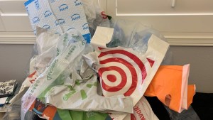 Reusable plastic bags and unrecyclable film packaging from Southern California stores and retailers are seen in Laguna Niguel. Jan Dell/Handout via REUTERS