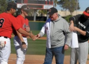 The late Jim Dietz with San Diego State players in a photo released before the program retired his number in 2011. Photo credit: goaztecs.com