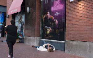 A homeless man sleeps in the Gaslamp Quarter of San Diego. Photo by Chris Stone