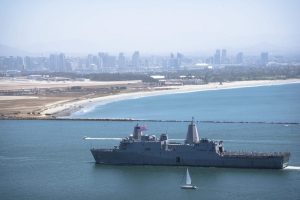 The amphibious transport dock ship USS San Diego returns to its homeport through the one narrow opening to San Diego Bay. Navy photo