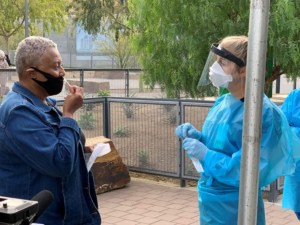 At San Diego County COVID testing sites, workers have turned to self swabs. Here, workers in San Ysidro help a patron. Photo credit: County News Center