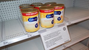 Cans of Enfamil baby formula, produced by Mead Johnson, on partially empty shelves in a Target store, amid continuing nationwide shortages in infant and toddler formula, in San Diego on May 25, 2022. REUTERS/Bing Guan