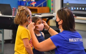 A teacher adjusts a mask on one of her students at Lafayette Elementary School in Clairemont on the first day back to school.A teacher adjusts a mask on one of her students at Lafayette Elementary School in Clairemont. File photo by Chris Stone