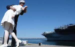 The statue symbolizing the celebration of Victory Day in 1945 sits adjacent to the USS Midway Museum. Photo by Chris Stone