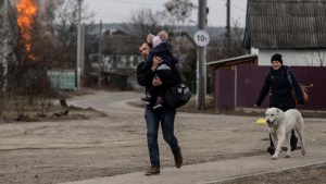 Family with dog flees shellingA family with their dog flees a town near Kyiv during Russian shelling. REUTERS/Carlos Barria