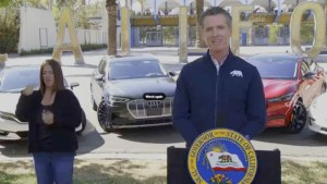 Flanked by electric vehicles, Gov. Gavin Newsom in 2020 announces a proposed ban on gas-powered vehicles sales effective 2035. Image from livestream